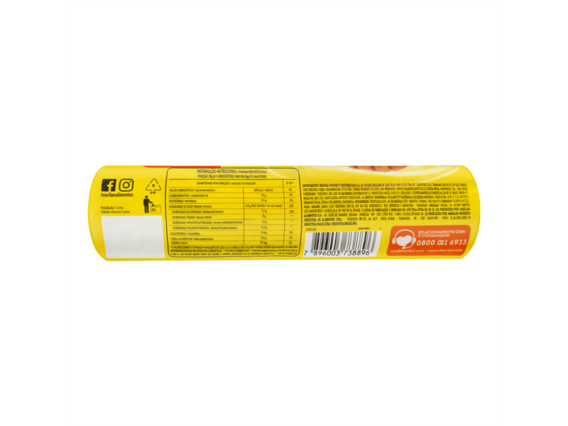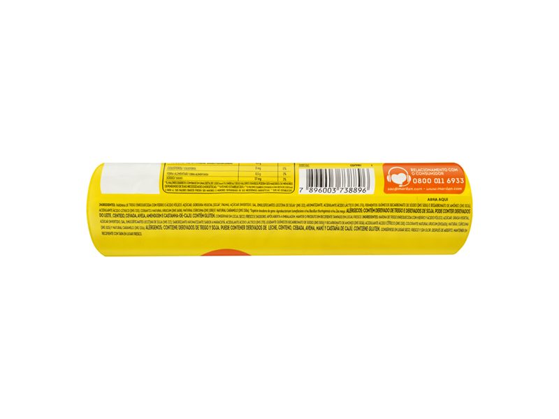 INGREDIENTES: FARINHA DE TRIGO ENRIQUECIDA COM FERRO E ÁCIDO FÓLICO, AÇÚCAR, GORDURA VEGETAL (SOJA*, PALMA), AÇÚCAR INVERTIDO, SAL, EMULSIFICANTES LECITINA DE SOJA* (INS 322), AROMATIZANTE, ACIDULANTE ÁCIDO LÁCTICO (INS 270), FERMENTOS QUÍMICOS BICARBONATO DE SÓDIO (INS 500II) E BICARBONATO DE AMÔNIO (INS 503II), ACIDULANTE ÁCIDO CÍTRICO (INS 330), CORANTES NATURAL URUCUM (INS 160B), NATURAL CÚRCUMA (INS 100I) E NATURAL CARAMELO (INS 150A).